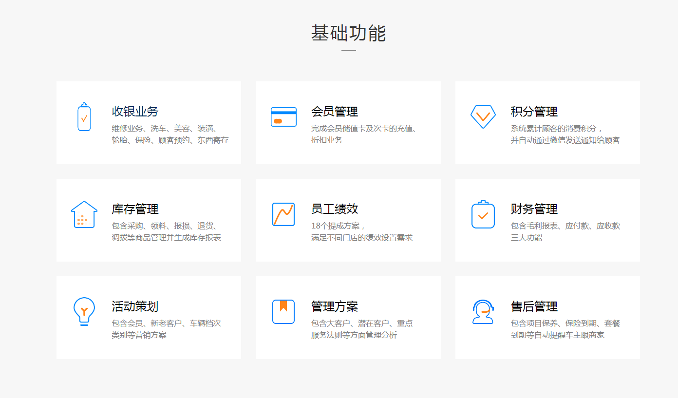 维修业务、洗车、美容、装潢、轮胎、保险、顾客预约、东西寄存。通过搜索客户姓名、手机号或是扫描车牌,选定客户,选择施工项目以及每个项目对应的服务顾问和施工人员,便可自动生成订单,客户到收银台无需再等待手动纸质开单,就可直接付款买单。