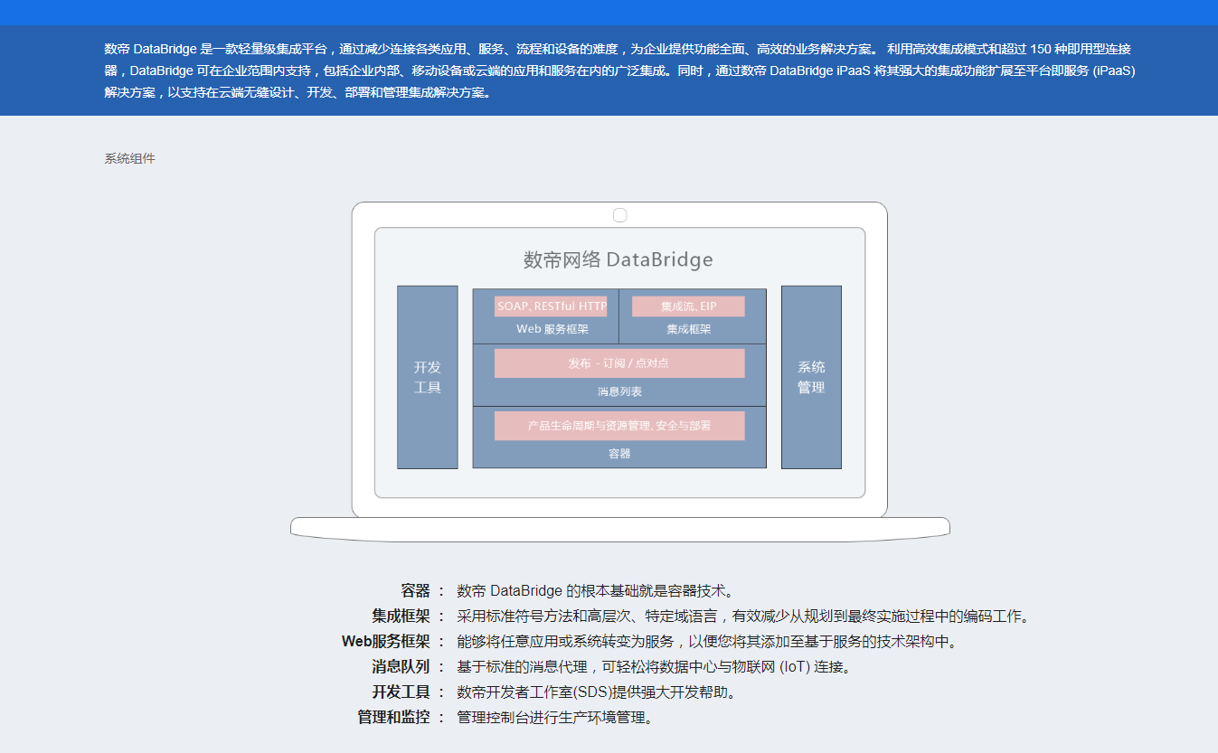 DataBridge 是一款轻量级集成平台,通过减少连接各类应用、服务、流程和设备的难度,为企业提供功能全面、高效的业务解决方案。 利用高效集成模式和超过 150 种即用型连接器,DataBridge 可在企业范围内支持,包括企业内部、移动设备或云端的应用和服务在内的广泛集成。同时,通过数帝 DataBridge iPaaS 将其强大的集成功能扩展至平台即服务 (iPaaS) 解决方案,以支持在云端无缝设计、开发、部署和管理集成解决方案。