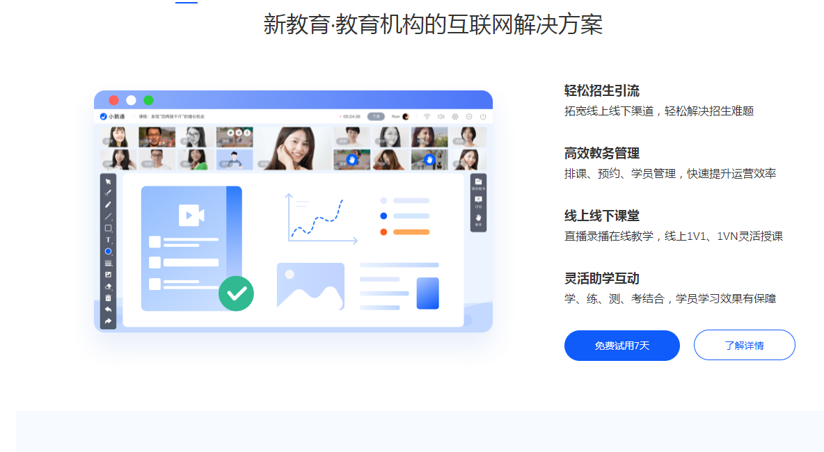 小鹅通在线教育解决方案主打轻量级、易操作、好上手、结合微信生态、可依赖讲师本身IP效应、提供移动+PC双重学习解决方案,一站式解决招生、开课、督学、管理四大难题,使得在线教育的创业效率越来越高,成本越来越低,只需要解决师资、教研,不再为开发平台而忧虑。