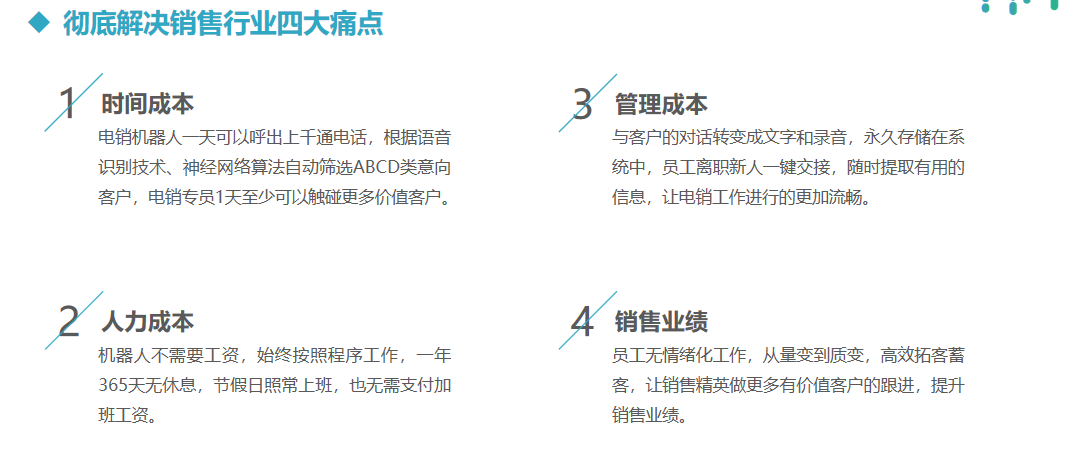 专为企业电销团队开发,基于智能语音识别技术、神经网络等算法等模拟真人声音与客户进行电话销售,替代了人工机械式的工作,操作简单,导入号码自主呼叫,毫秒级响应,全年无休,适应多种场景化应用,最大限度地提升企业电销效率。